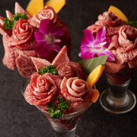 黒毛和牛上カルビや上赤身、名物の黒毛和牛ロング中落カルビなど和牛焼肉をとってもリーズナブルに楽しめる当店の一押し看板コースです。さらに花びらのように盛り付けた和牛肉パフェは事前予約で無料サービスしております。ご希望のメッセージを添えて大切な記念日を彩ります。席時間100分制LO80分ーーーーーーーー【飲み放題料金】※必ずつけていただいており、詳細は当日ご案内させていただきます。(通常価格)ソフトドリンク450円(税込490円)アルコール:1,000円(税込1,100円)(LINE友達価格)ソフトドリンク350円(税込380円)アルコール:750円(税込820円)